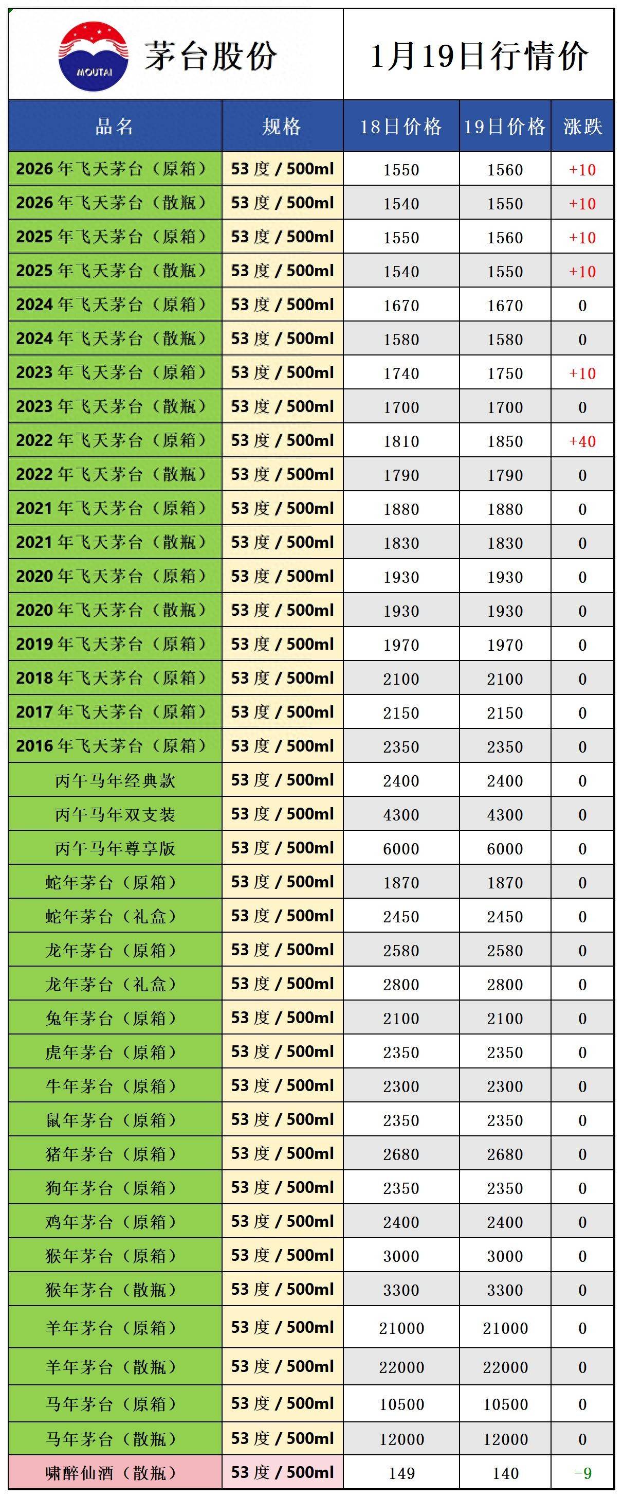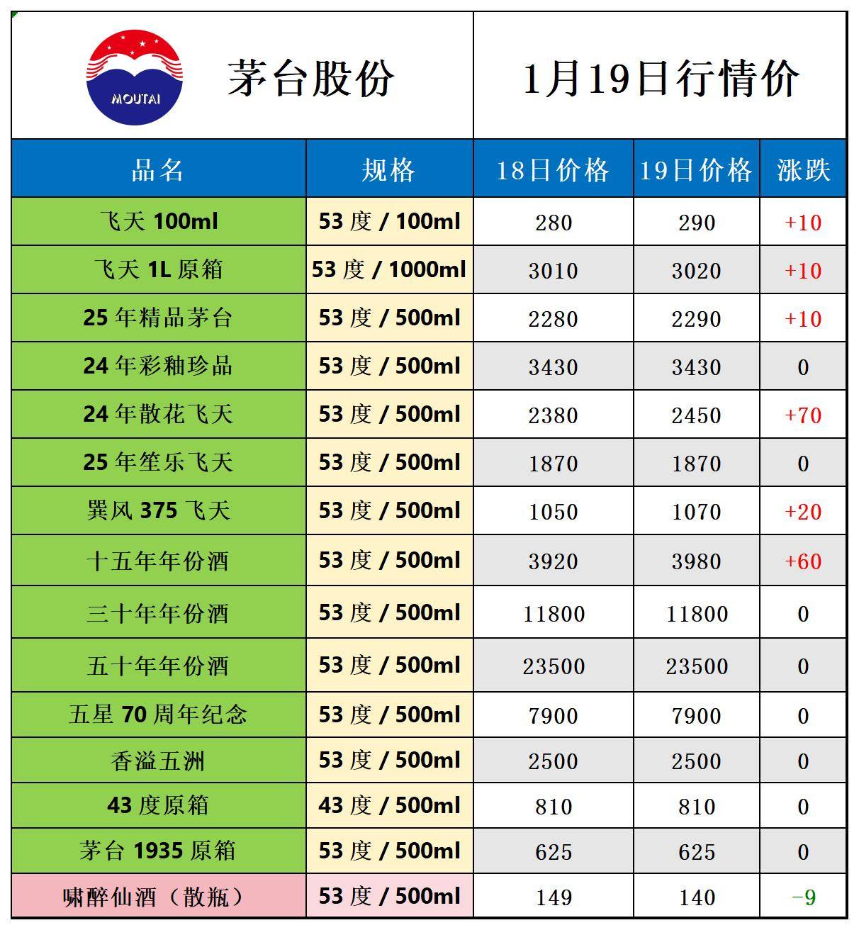 全线上涨,茅台酒1月19日行情