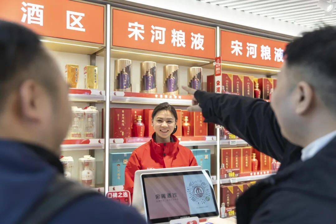 步入“宋河酒饮到家”,暖光映照下的货架陈设,透露了其场景化运营的巧思。